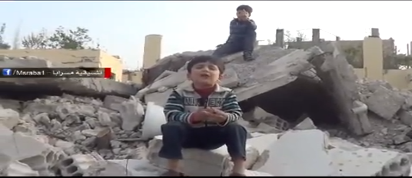 Intona una canzone chiedendo libertà questo piccolo siriano, seduto insieme ai fratellini sulle macerie della sua casa. Rimasto senza la sua cameretta, senza i suoi giochi, i suoi vestiti, indossa ciabatte troppo grandi per i suoi piedini.
