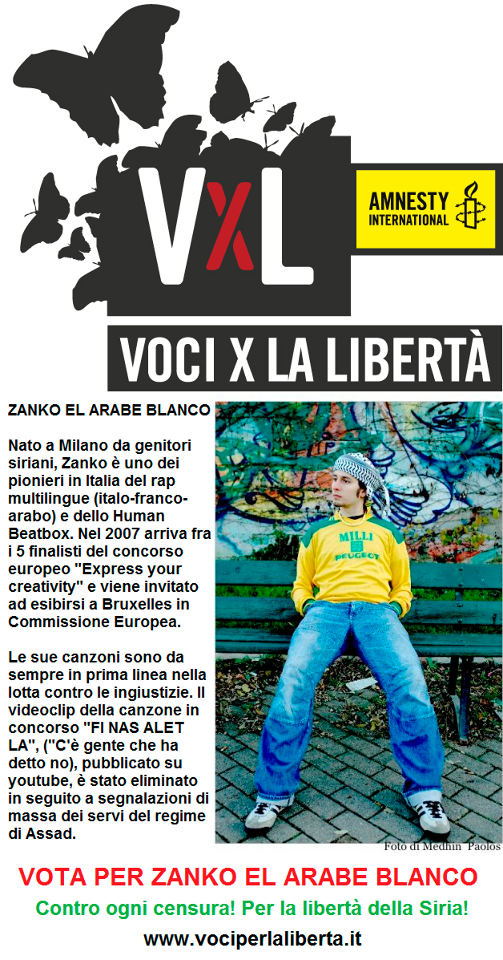 ZANKO EL ARABE BLANCO è nato a Milano da genitori siriani ed è uno dei pionieri in Italia del rap multilingue (italo-franco-arabo) e dello Human Beatbox. Nel 2007 arriva fra i 5 finalisti del concorso europeo “Express your creativity” e viene invitato ad esibirsi a Bruxelles in Commissione Europea.