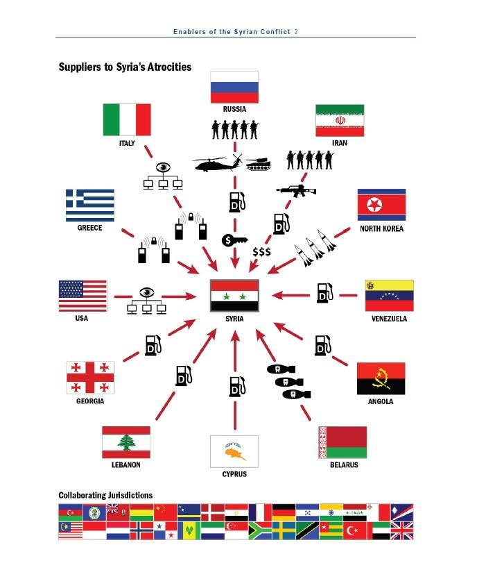Questo grafico, realizzato dal Human Rights First mostra il sostegno offerto al regime di assad nella sua guerra contro la popolazione civile siriana. Alcuni sostenitori sono governi stranieri, altri sono multinazionali e aziende di varia natura. Ci sono certamente altre realtà non incluse in questo diagramma.
