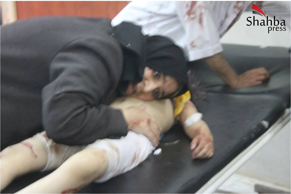 Il bambino è su una barella: è rimasto gravemente ferito durante il bombardamento.