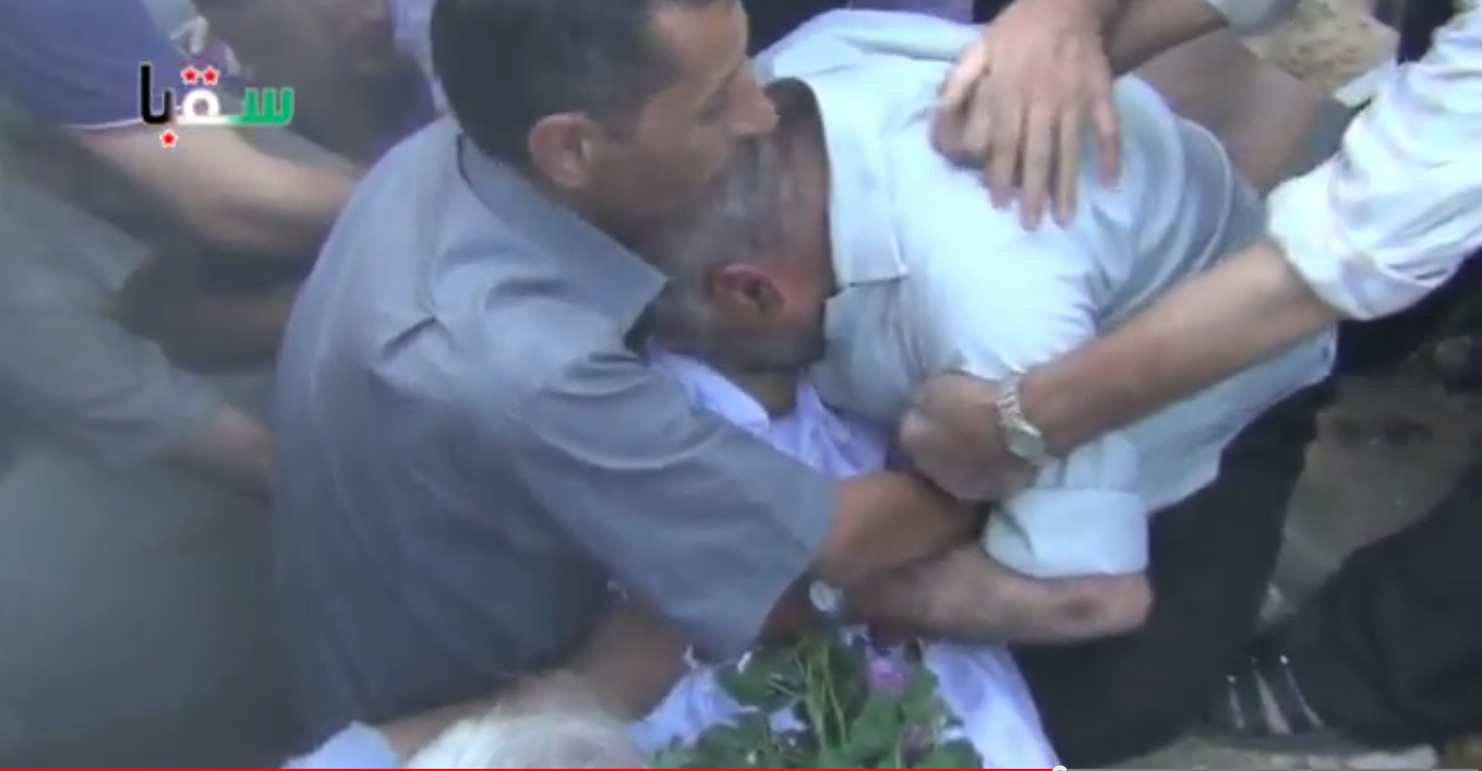 Un giovane siriano, Mahmoud Abu Habra, è stato ucciso. Familiari, vicini di casa, amici portano il corpo avvolto in un sudario bianco fino al luogo della sepoltura.