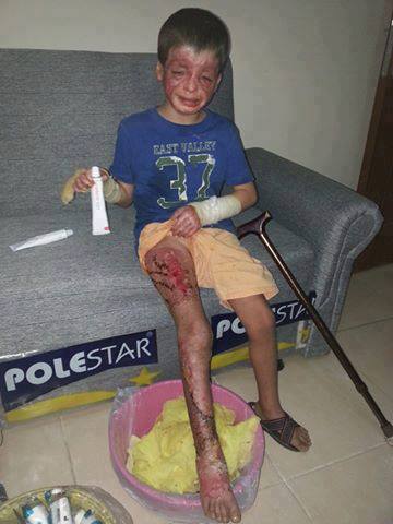 Quanto dovranno ancora patire questi bambini? Guardate il piccolo nella foto: si chiama Ghassan Al Aly ed è della città di Deir Ezzore. Fissate per un istante il suo viso, le sue braccia, le sue gambe. Fermatevi a guardare la sua espressione, il suo dolore. Notate quel tubo che ha in mano, quella pomata che dovrebbe dargli sollievo. Ma non è forse anche lui un essere umano? Quanto può soffrire un piccolo in quelle condizioni?