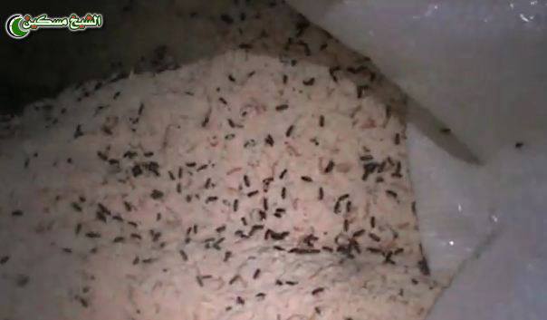 Questo video documenta lo stato penoso della farina contenuta nei sacchi che il regime ha fatto entrare nella città di Sheikh Meskin: decine di sacchi di prodotto avariato, che pullulano di vermi.