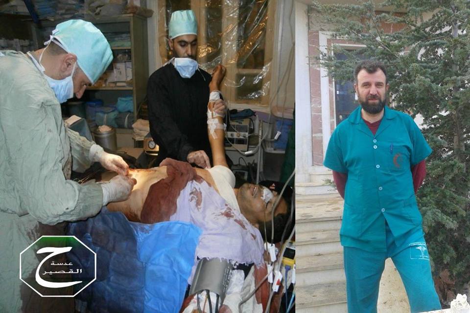 La pagina Facebook dedicata al racconto della vita quotidiana dei civili siriani nella città di Al Qusair, in provincia di Homs, ha pubblicato oggi questa doppia foto. Sulla destra si vede un medico, lo stesso professionista che, nel riquadro di sinistra è in un ospedale da campo, intento a svolgere un’operazione chirurgica su un ferito.