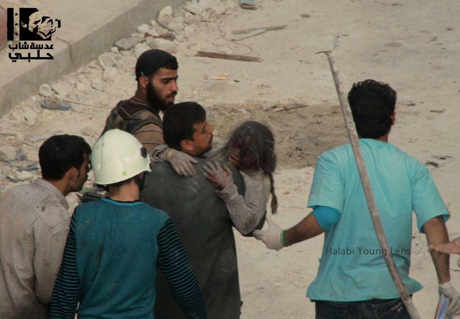 Le espressioni sono tese, il momento è drammatico. Nei fotogramma la vita e la morte sembrano convivere, sembrano alternarsi. Non è un evento isolato, è purtroppo la quotidianità della vita ad Aleppo e nelle altre città siriane bombardate dall’aviazione militare di assad.