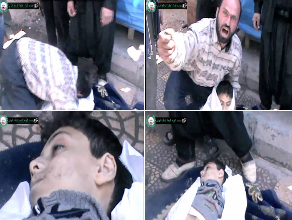 Il corpo del piccolo Luay Aldelhaq viene portato al padre avvolto in un sudario bianco. E’ una delle vittime del pesante bombardamento che oggi ha colpito la città di Douma. L’uomo in un primo momento giura vendetta contro bashar al assad: “Mi farò giustizia da solo, con le mie mani. Mi farò giustizia contro chi ti ha ucciso Luay”.