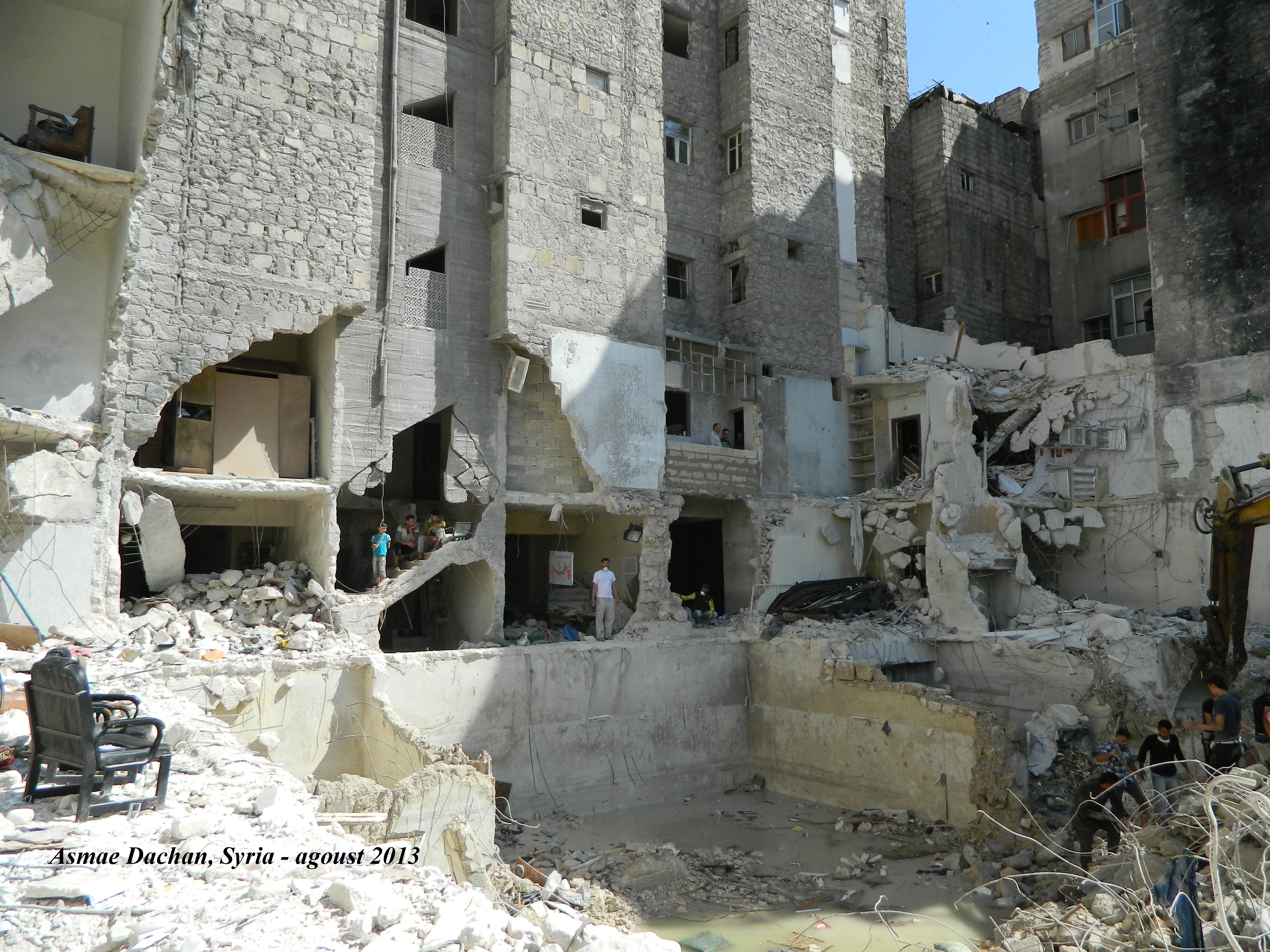 “La Protezione Civile in Siria è un Corpo dello Stato e quindi risponde agli ordini del regime, che ha vietato gli interventi nelle zone bombardate. Per questo molti di noi hanno abbandonato il loro ruolo ufficiale e abbiamo dato vita alla Protezione Civile Libera (PCL), che invece è al servizio di tutti i siriani. Con noi si sono uniti centinaia di volontari, anche senza alcuna preparazione. Ciò che ha sempre mosso i nostri comportamenti è il desiderio di aiutare gli altri, di tentare di salvare quante più vite umane possibile. Molti di noi non hanno vissuto i bombardamenti di Hama nell’82 e non avevano mai assistito a scene tanto cruente: ad Aleppo e nella altre città siriane nessuno avrebbe immaginato di vedere corpi dilaniati nelle strade, teste e arti staccati, pozze di sangue, bambini esanimi, case piegate su se stesse. Spesso, quando ci sono bombardamenti, la gente si raggruppa nel luogo dove è caduto l’ordigno per cercare di aiutare i superstiti e allora gli aerei colpiscono nuovamente, compiendo stragi anche tra i soccorritori”.