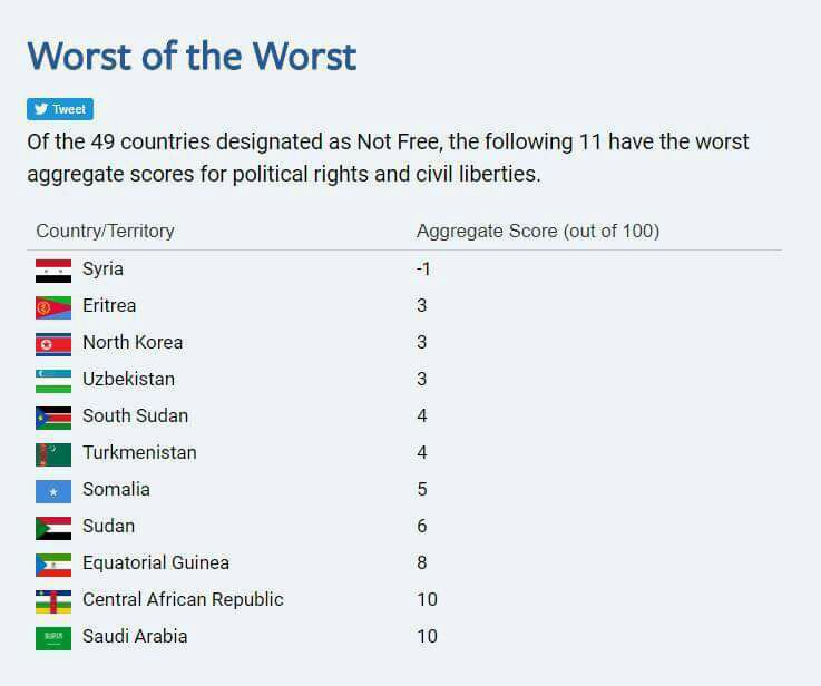 Secondo la statistica 2017 di Freedom House, la Siria si classifica a -1 tra i Paesi meno liberi al mondo.