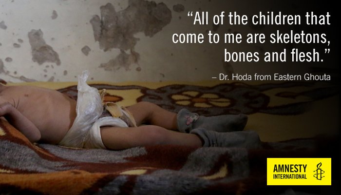 “Tutti i bambini che vengono da noi sono come scheletri, ridotti pelle e ossa”, ha dichiarato Hoda, una dottoressa di al Ghouta, cittĂ a poche decine di chilometri dalla capitale Damasco, dove sono assediati almeno 400mila civili.