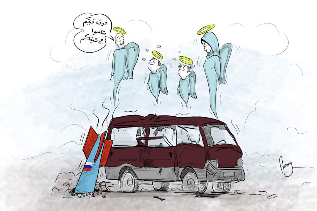 “Sono stati sfollati verso il cielo”, scrive sul suo profilo Twitter il professor Abdulkafi Alhamdo, riportando la notizia del bombardamento che ha colpito un piccolo bus per sfollati, uccidendo una famiglia di 9 persone nella periferia di Aleppo.