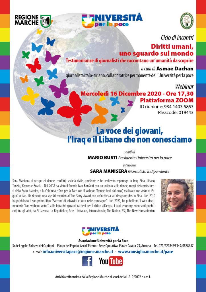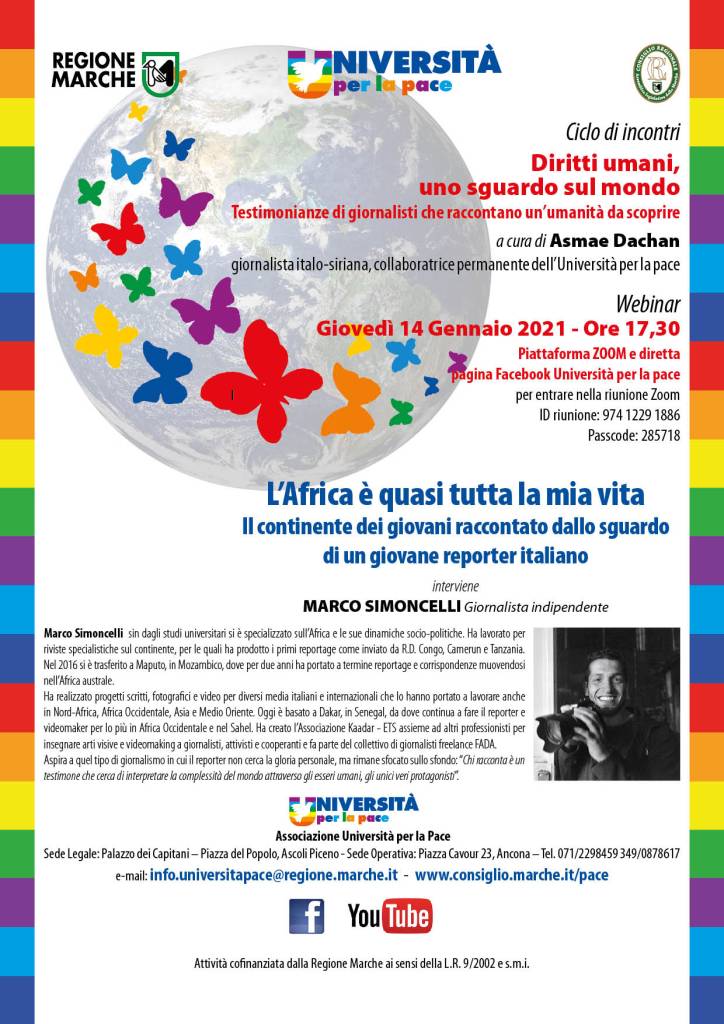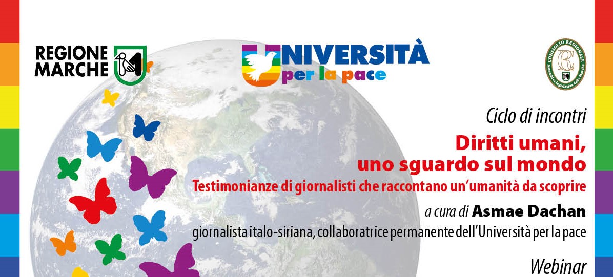 “Diritti umani, uno sguardo sul mondo. Testimonianze di giornalisti che raccontano un’umanità da scoprire”, è il ciclo di incontri in video conferenza promosso dall’Università per la Pace, con il patrocinio di Consiglio e Regione Marche che sto curando da gennaio.