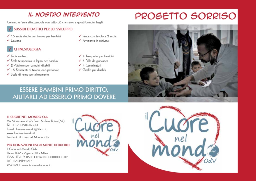 Tra di loro un’amica incontrata “sulla via di Damasco”, Claudia Ceniti, che con la sua onlus, Il Cuore nel Mondo, da anni aiuta la Siria attraverso diversi progetti benefici, oltre a continuare ad aiutare bambini bisognosi in altre aree del mondo. Il Cuore nel Mondo ha preso a cuore la situazione del centro, che cura gratuitamente i bambini e che ha bisogno di un sostegno continuo e su più livelli e ha avviato una raccolta fondi attraverso il “Progetto Sorriso”. L’iniziativa mira a raccogliere fondi per l’acquisto di specifici sussidi didattici per lo sviluppo di bambini con disabilità fisiche e mentali e l’acquisto di apparecchiature per la chinesiologia, indispensabili per sostenere il lavoro del centro.
