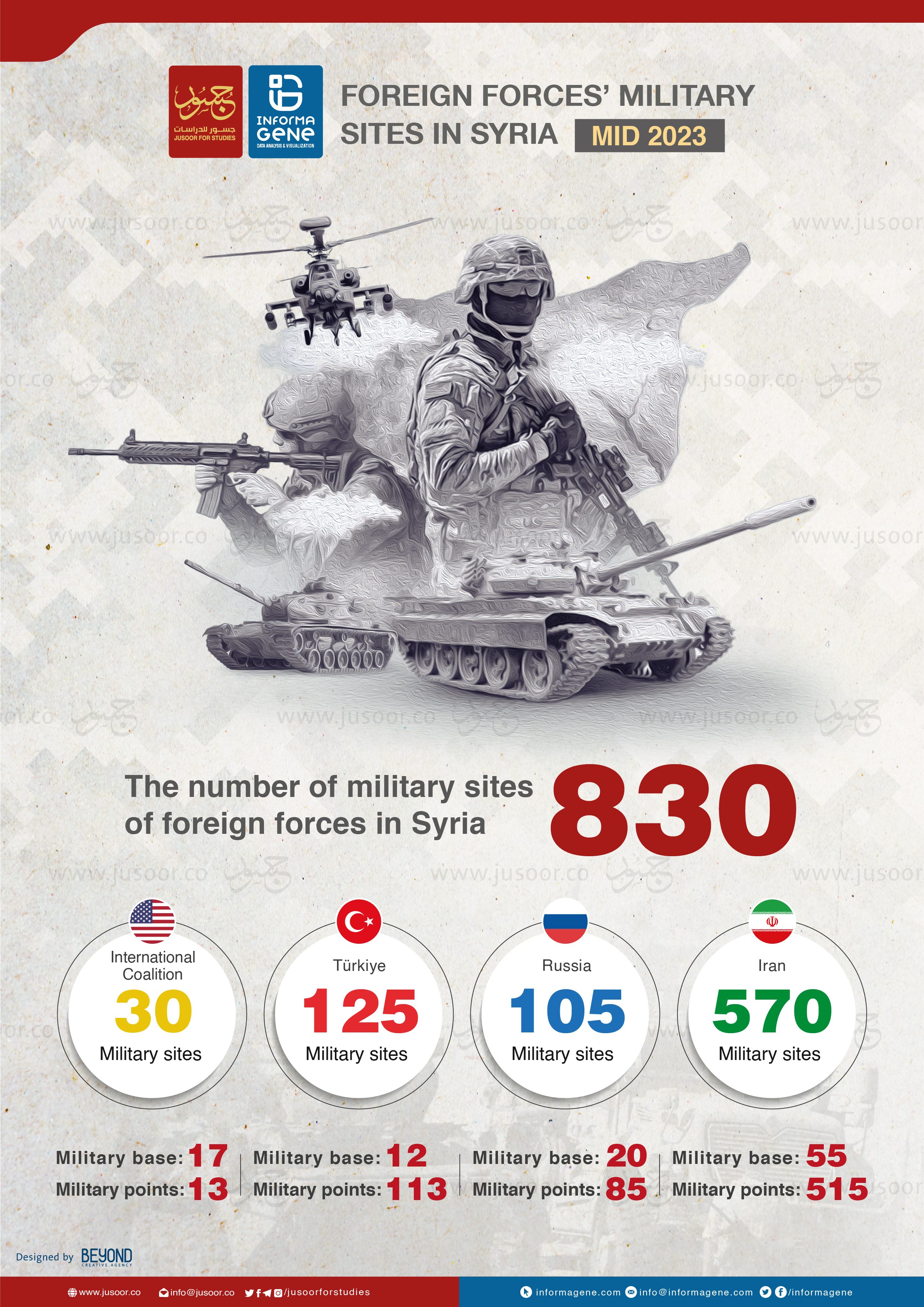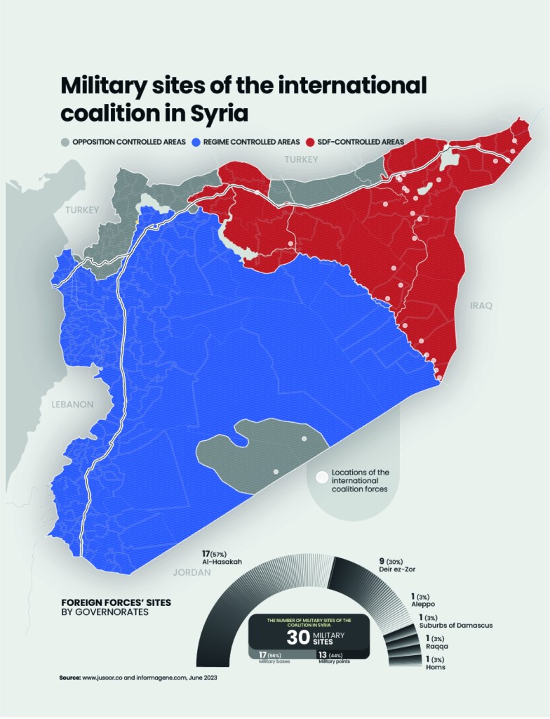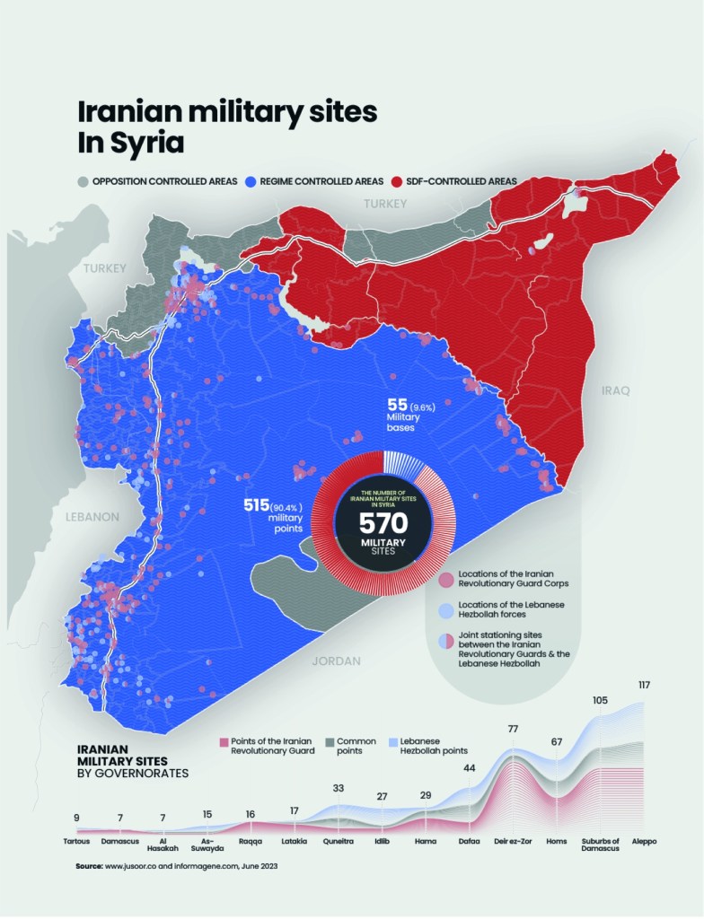 Il “Jusoor Center for Studies”, in collaborazione con “InformaGene for Data Analysis Foundation”, ha inoltre pubblicato una serie di mappe e grafici analitici che indica le località con basi militari straniere in Siria a metà del 2023, per un totale di 830 siti militari distribuiti tra i paesi che controllano la scena in Siria: la Coalizione Internazionale guidata dagli Stati Uniti, la Russia, la Turchia e soprattutto l’Iran.