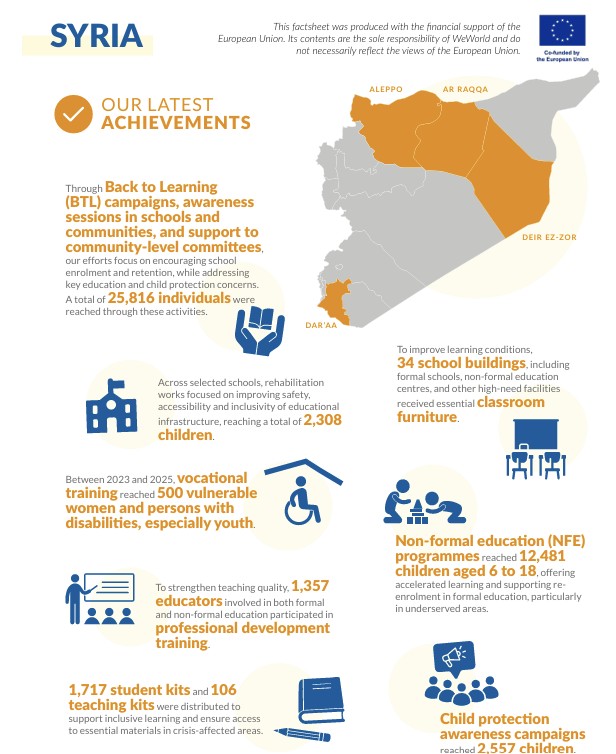 Il report ricorda che la mancanza di bagni separati e di supporto per la gestione del ciclo mestruale è una delle principali cause di assenza scolastica femminile. In Siria, dove la povertà è estrema e la sicurezza instabile, le adolescenti sono tra le più a rischio di abbandono scolastico e matrimonio precoce. Il CARES Framework insiste sul ruolo della comunità. In Siria, questo significa coinvolgere genitori, caregiver, leader locali, comitati scolastici. Significa ricostruire fiducia in un Paese dove la fiducia è stata erosa dalla guerra. WeWorld lavora con le comunità per contrastare il lavoro minorile; prevenire matrimoni precoci; sostenere l’inclusione dei bambini con disabilità; riportare a scuola chi l’ha abbandonata.