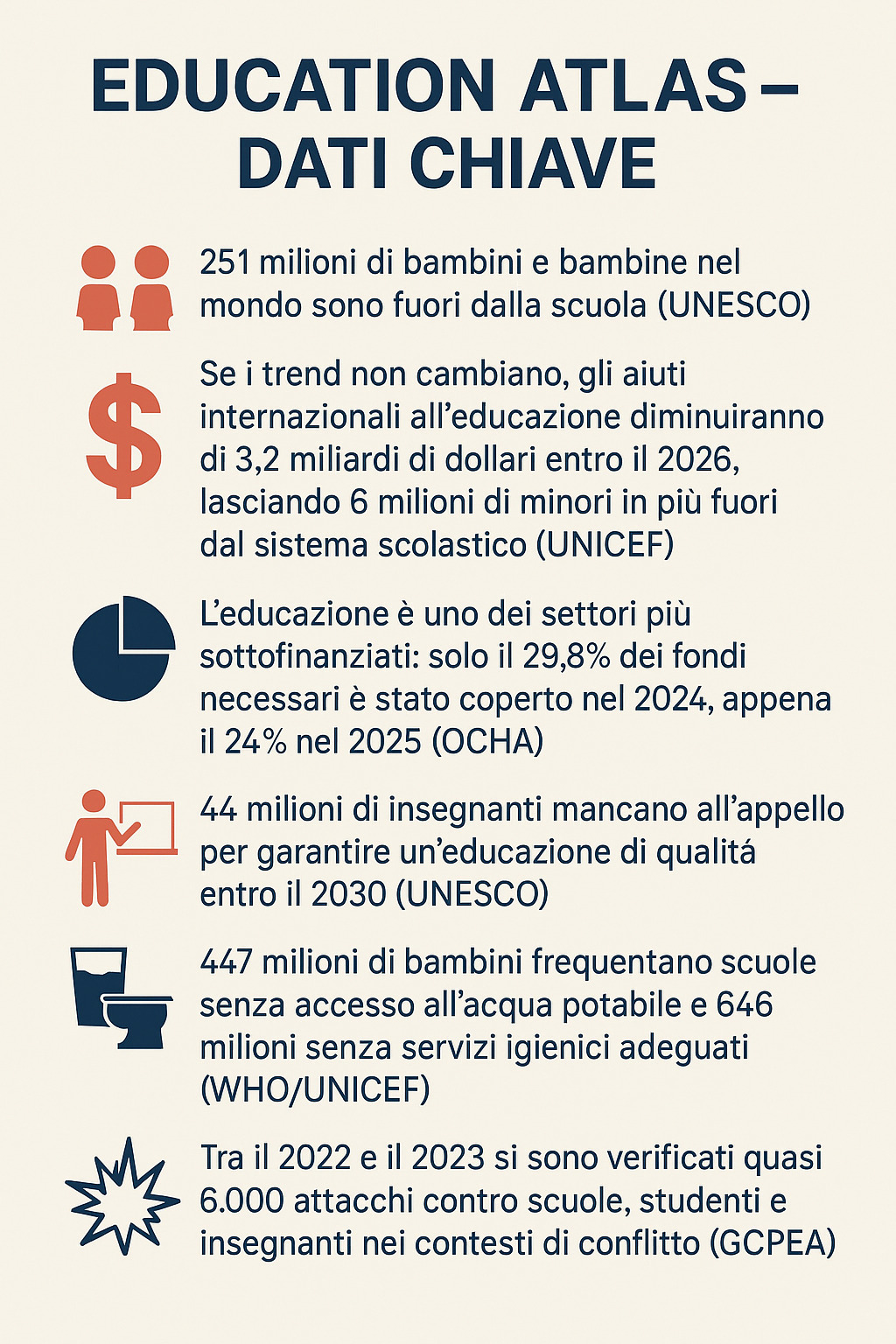 Il report lancia un allarme: l’educazione è uno dei settori meno finanziati al mondo. Nel 2025, i tagli dei donatori hanno portato a una riduzione prevista del 9–17% degli aiuti internazionali (OECD, 2025).